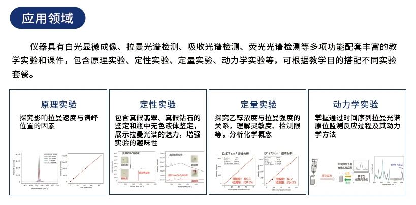 擁有較高的光譜分辨率、檢測靈敏度和光譜信噪比,具備白光顯微成像、拉曼光譜檢測、吸收光譜檢測、熒光光譜檢測等多項(xiàng)教學(xué)功能。
